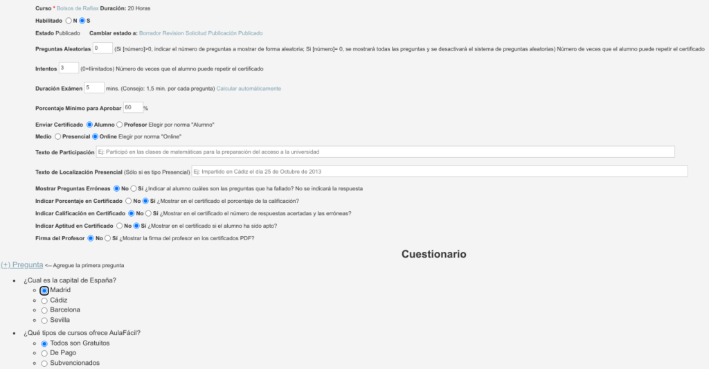 Creación y gestión de los certificados de los cursos, para poder agregar cada una de las preguntas, así como sus posibles respuestas. La creación de los nuevos certificados se pueden hacer de forma visual, pero también está la opción de la importación a través de excel de los certificados de los cursos los cuales son entregados por cada profesor.