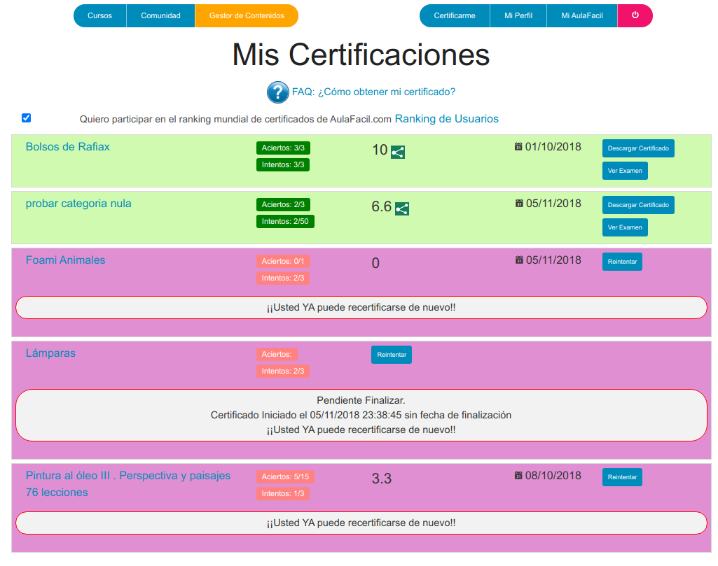 - Area de certificación donde cada uno de los alumnos puede certificarse de cada uno de los cursos que el alumno quiera.